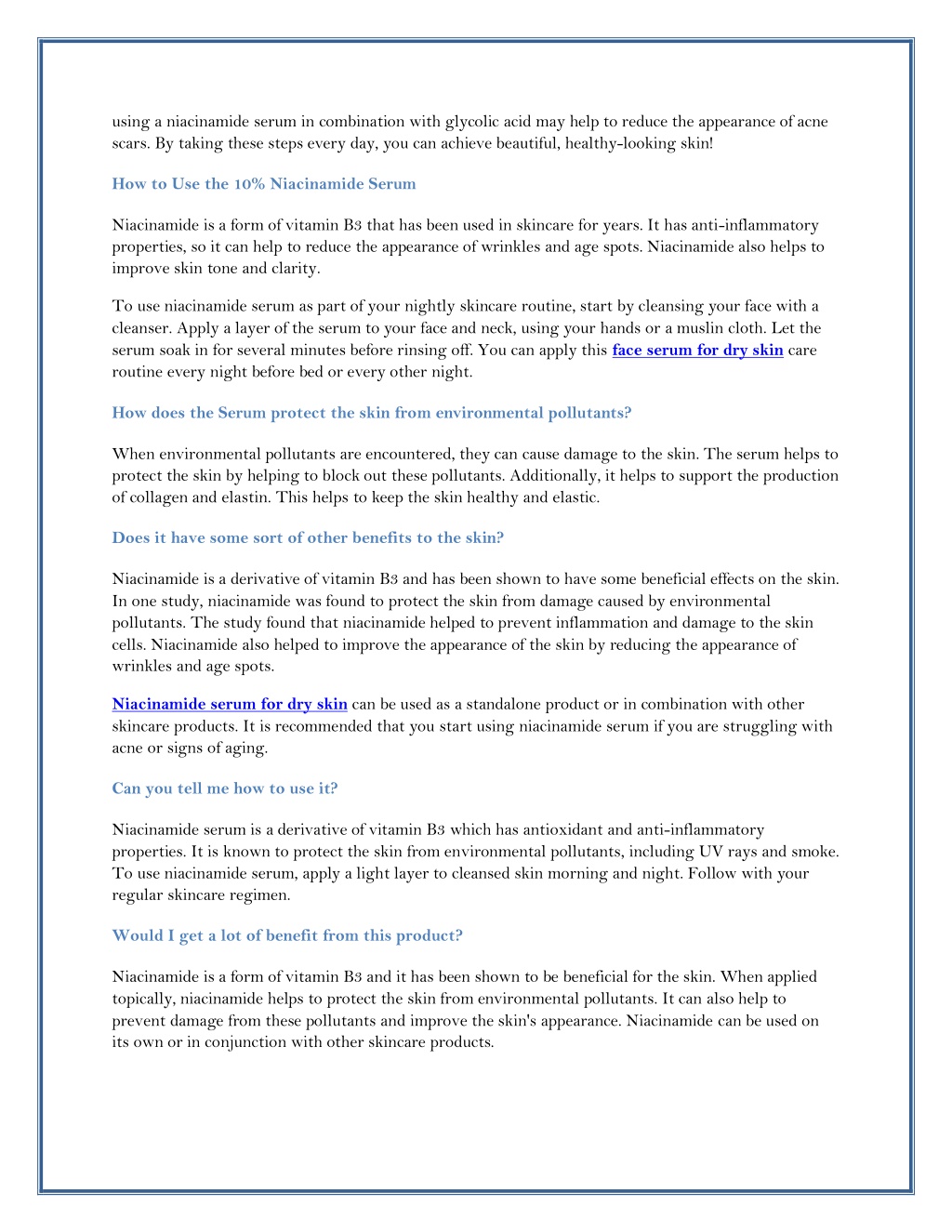 using a niacinamide serum in combination with glycolic acid may help to reduce the appearance of acne scars. By taking these steps every day, you can achieve beautiful, healthy-looking skin! How to Use the 10% Niacinamide Serum Niacinamide is a form of vitamin B3 that has been used in skincare for years. It has anti-inflammatory properties, so it can help to reduce the appearance of wrinkles and age spots. Niacinamide also helps to improve skin tone and clarity. To use niacinamide serum as part of your nightly skincare routine, start by cleansing your face with a cleanser. Apply a layer of the serum to your face and neck, using your hands or a muslin cloth. Let the serum soak in for several minutes before rinsing off. You can apply this face serum for dry skin care routine every night before bed or every other night. How does the Serum protect the skin from environmental pollutants? When environmental pollutants are encountered, they can cause damage to the skin. The serum helps to protect the skin by helping to block out these pollutants. Additionally, it helps to support the production of collagen and elastin. This helps to keep the skin healthy and elastic. Does it have some sort of other benefits to the skin? Niacinamide is a derivative of vitamin B3 and has been shown to have some beneficial effects on the skin. In one study, niacinamide was found to protect the skin from damage caused by environmental pollutants. The study found that niacinamide helped to prevent inflammation and damage to the skin cells. Niacinamide also helped to improve the appearance of the skin by reducing the appearance of wrinkles and age spots. Niacinamide serum for dry skin can be used as a standalone product or in combination with other skincare products. It is recommended that you start using niacinamide serum if you are struggling with acne or signs of aging. Can you tell me how to use it? Niacinamide serum is a derivative of vitamin B3 which has antioxidant and anti-inflammatory properties. It is known to protect the skin from environmental pollutants, including UV rays and smoke. To use niacinamide serum, apply a light layer to cleansed skin morning and night. Follow with your regular skincare regimen. Would I get a lot of benefit from this product? Niacinamide is a form of vitamin B3 and it has been shown to be beneficial for the skin. When applied topically, niacinamide helps to protect the skin from environmental pollutants. It can also help to prevent damage from these pollutants and improve the skin's appearance. Niacinamide can be used on its own or in conjunction with other skincare products.