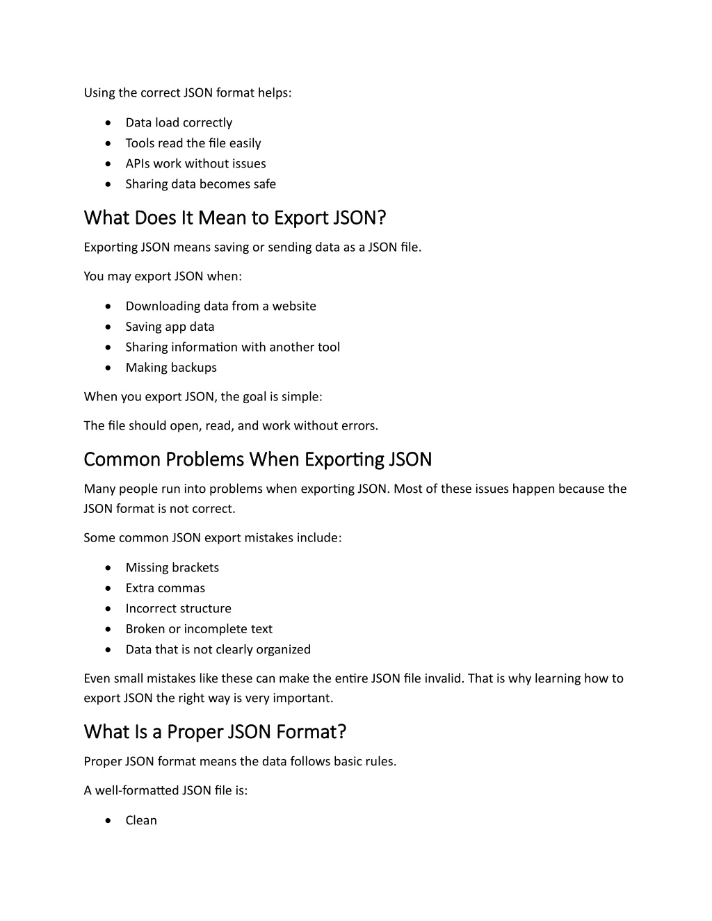 Using the correct JSON format helps: •Data load correctly •Tools read the file easily •APIs work without issues •Sharing data becomes safe What Does It Mean to Export JSON? What Does It Mean to Export JSON? Exporting JSON means saving or sending data as a JSON file. You may export JSON when: •Downloading data from a website •Saving app data •Sharing information with another tool •Making backups When you export JSON, the goal is simple: The file should open, read, and work without errors. Common Problems When Exporting JSON Common Problems When Exporting JSON Many people run into problems when exporting JSON. Most of these issues happen because the JSON format is not correct. Some common JSON export mistakes include: •Missing brackets •Extra commas •Incorrect structure •Broken or incomplete text •Data that is not clearly organized Even small mistakes like these can make the entire JSON file invalid. That is why learning how to export JSON the right way is very important. What Is a Proper JSON Format? What Is a Proper JSON Format? Proper JSON format means the data follows basic rules. A well-formatted JSON file is: •Clean