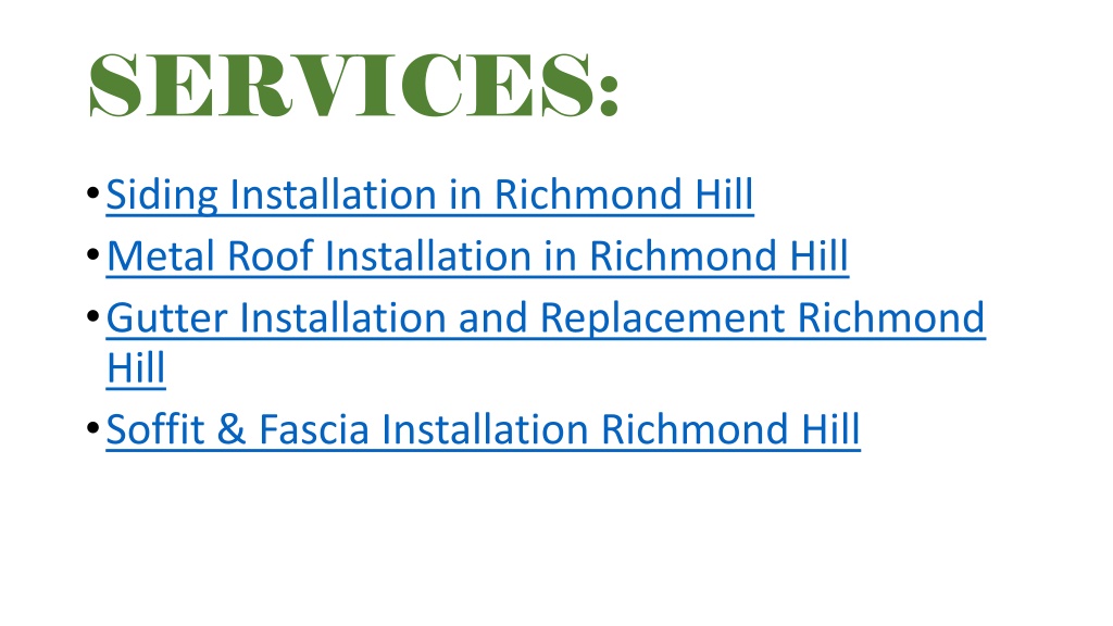 SERVICES: • Siding Installation in Richmond Hill • Metal Roof Installation in Richmond Hill • Gutter Installation and Replacement Richmond Hill • Soffit & Fascia Installation Richmond Hill