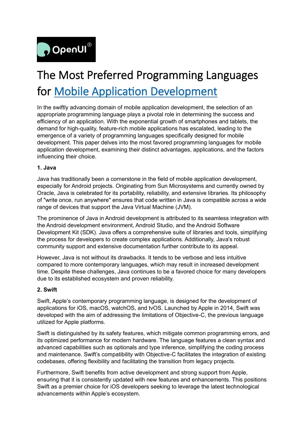 The Most Preferred Programming Languages The Most Preferred Programming Languages for for Mobile Application Development Mobile Application Development In the swiftly advancing domain of mobile application development, the selection of an appropriate programming language plays a pivotal role in determining the success and efficiency of an application. With the exponential growth of smartphones and tablets, the demand for high-quality, feature-rich mobile applications has escalated, leading to the emergence of a variety of programming languages specifically designed for mobile development. This paper delves into the most favored programming languages for mobile application development, examining their distinct advantages, applications, and the factors influencing their choice. 1. Java Java has traditionally been a cornerstone in the field of mobile application development, especially for Android projects. Originating from Sun Microsystems and currently owned by Oracle, Java is celebrated for its portability, reliability, and extensive libraries. Its philosophy of "write once, run anywhere" ensures that code written in Java is compatible across a wide range of devices that support the Java Virtual Machine (JVM). The prominence of Java in Android development is attributed to its seamless integration with the Android development environment, Android Studio, and the Android Software Development Kit (SDK). Java offers a comprehensive suite of libraries and tools, simplifying the process for developers to create complex applications. Additionally, Java's robust community support and extensive documentation further contribute to its appeal. However, Java is not without its drawbacks. It tends to be verbose and less intuitive compared to more contemporary languages, which may result in increased development time. Despite these challenges, Java continues to be a favored choice for many developers due to its established ecosystem and proven reliability. 2. Swift Swift, Apple’s contemporary programming language, is designed for the development of applications for iOS, macOS, watchOS, and tvOS. Launched by Apple in 2014, Swift was developed with the aim of addressing the limitations of Objective-C, the previous language utilized for Apple platforms. Swift is distinguished by its safety features, which mitigate common programming errors, and its optimized performance for modern hardware. The language features a clean syntax and advanced capabilities such as optionals and type inference, simplifying the coding process and maintenance. Swift’s compatibility with Objective-C facilitates the integration of existing codebases, offering flexibility and facilitating the transition from legacy projects. Furthermore, Swift benefits from active development and strong support from Apple, ensuring that it is consistently updated with new features and enhancements. This positions Swift as a premier choice for iOS developers seeking to leverage the latest technological advancements within Apple’s ecosystem.