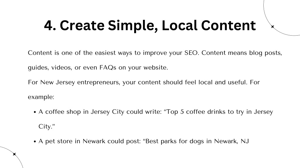 4. Create Simple, Local Content Content is one of the easiest ways to improve your SEO. Content means blog posts, guides, videos, or even FAQs on your website. For New Jersey entrepreneurs, your content should feel local and useful. For example: A coffee shop in Jersey City could write: “Top 5 coffee drinks to try in Jersey City.” A pet store in Newark could post: “Best parks for dogs in Newark, NJ