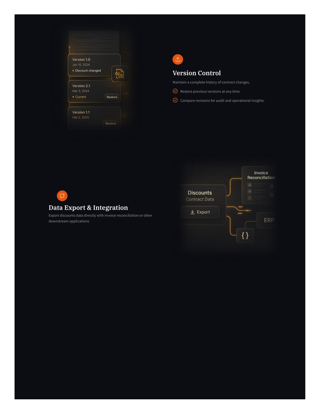 Version Control Maintain a complete history of contract changes. Restore previous versions at any time. Compare revisions for audit and operational insights. Data Export & Integration Export discounts data directly with invoice reconciliation or other downstream applications