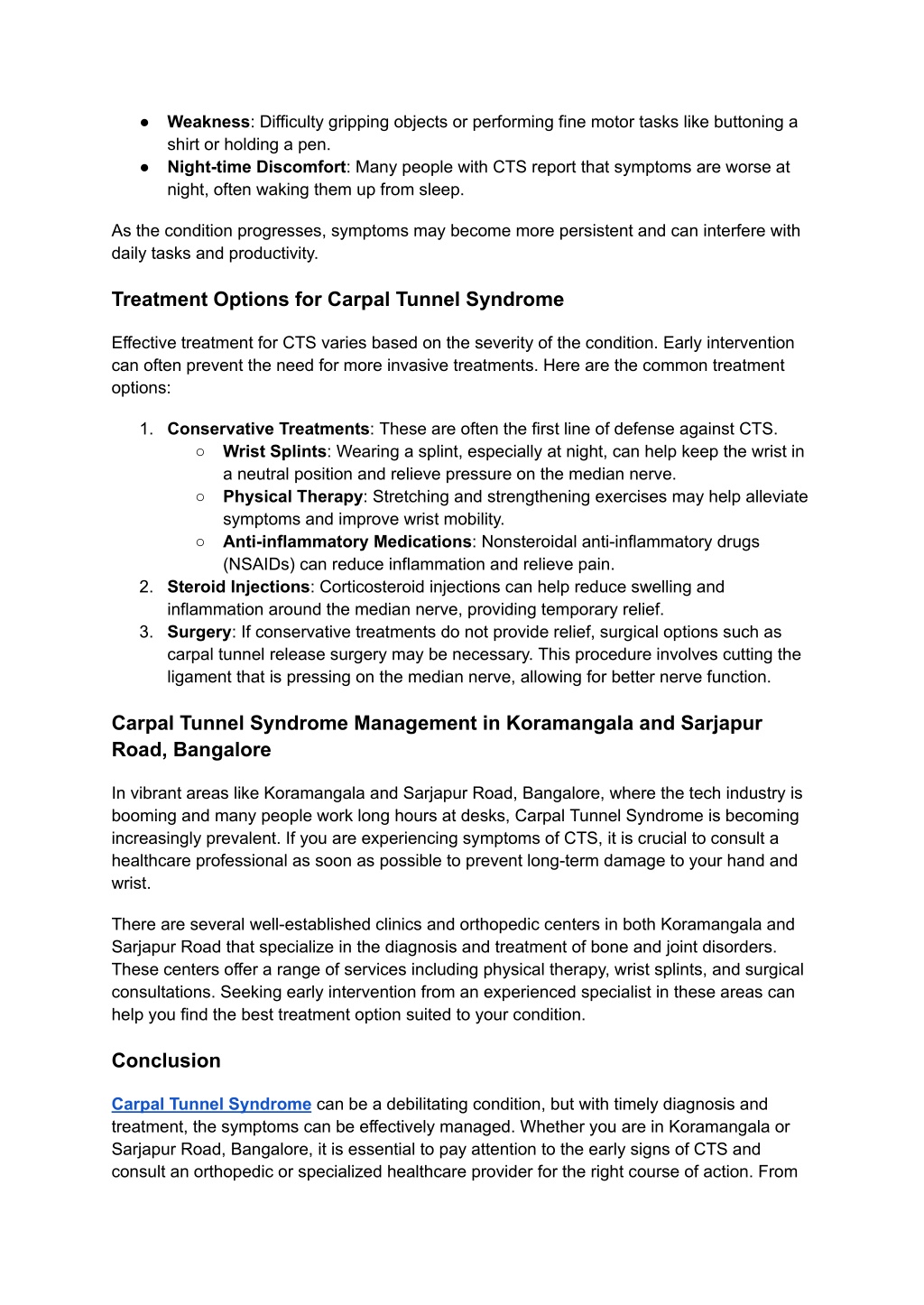 ● Weakness: Difficulty gripping objects or performing fine motor tasks like buttoning a shirt or holding a pen. ● Night-time Discomfort: Many people with CTS report that symptoms are worse at night, often waking them up from sleep. As the condition progresses, symptoms may become more persistent and can interfere with daily tasks and productivity. Treatment Options for Carpal Tunnel Syndrome Effective treatment for CTS varies based on the severity of the condition. Early intervention can often prevent the need for more invasive treatments. Here are the common treatment options: 1. Conservative Treatments: These are often the first line of defense against CTS. ○ Wrist Splints: Wearing a splint, especially at night, can help keep the wrist in a neutral position and relieve pressure on the median nerve. ○ Physical Therapy: Stretching and strengthening exercises may help alleviate symptoms and improve wrist mobility. ○ Anti-inflammatory Medications: Nonsteroidal anti-inflammatory drugs (NSAIDs) can reduce inflammation and relieve pain. 2. Steroid Injections: Corticosteroid injections can help reduce swelling and inflammation around the median nerve, providing temporary relief. 3. Surgery: If conservative treatments do not provide relief, surgical options such as carpal tunnel release surgery may be necessary. This procedure involves cutting the ligament that is pressing on the median nerve, allowing for better nerve function. Carpal Tunnel Syndrome Management in Koramangala and Sarjapur Road, Bangalore In vibrant areas like Koramangala and Sarjapur Road, Bangalore, where the tech industry is booming and many people work long hours at desks, Carpal Tunnel Syndrome is becoming increasingly prevalent. If you are experiencing symptoms of CTS, it is crucial to consult a healthcare professional as soon as possible to prevent long-term damage to your hand and wrist. There are several well-established clinics and orthopedic centers in both Koramangala and Sarjapur Road that specialize in the diagnosis and treatment of bone and joint disorders. These centers offer a range of services including physical therapy, wrist splints, and surgical consultations. Seeking early intervention from an experienced specialist in these areas can help you find the best treatment option suited to your condition. Conclusion Carpal Tunnel Syndrome can be a debilitating condition, but with timely diagnosis and treatment, the symptoms can be effectively managed. Whether you are in Koramangala or Sarjapur Road, Bangalore, it is essential to pay attention to the early signs of CTS and consult an orthopedic or specialized healthcare provider for the right course of action. From