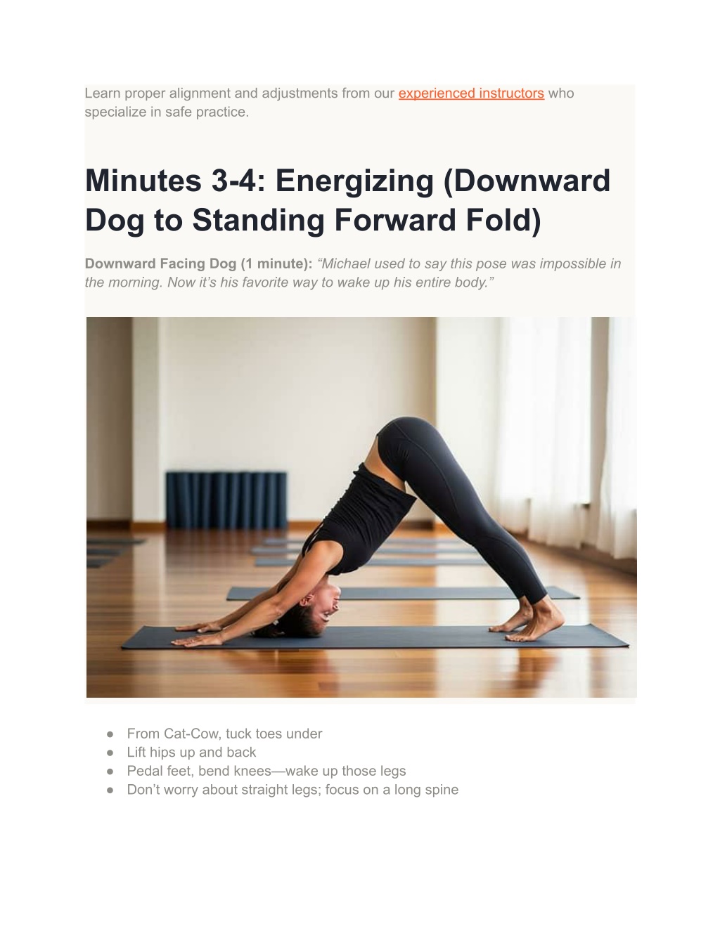 Learn proper alignment and adjustments from our experienced instructors who specialize in safe practice. Minutes 3-4: Energizing (Downward Dog to Standing Forward Fold) Downward Facing Dog (1 minute):“Michael used to say this pose was impossible in the morning. Now it’s his favorite way to wake up his entire body.” ● From Cat-Cow, tuck toes under ● Lift hips up and back ● Pedal feet, bend knees—wake up those legs ● Don’t worry about straight legs; focus on a long spine