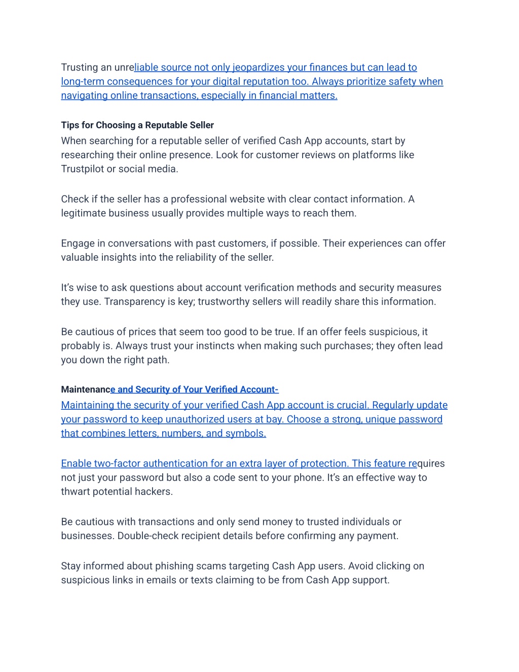 Trusting an unreliable source not only jeopardizes your finances but can lead to long-term consequences for your digital reputation too. Always prioritize safety when navigating online transactions, especially in financial matters. Tips for Choosing a Reputable Seller When searching for a reputable seller of verified Cash App accounts, start by researching their online presence. Look for customer reviews on platforms like Trustpilot or social media. Check if the seller has a professional website with clear contact information. A legitimate business usually provides multiple ways to reach them. Engage in conversations with past customers, if possible. Their experiences can offer valuable insights into the reliability of the seller. It’s wise to ask questions about account verification methods and security measures they use. Transparency is key; trustworthy sellers will readily share this information. Be cautious of prices that seem too good to be true. If an offer feels suspicious, it probably is. Always trust your instincts when making such purchases; they often lead you down the right path. Maintenance and Security of Your Verified Account- Maintaining the security of your verified Cash App account is crucial. Regularly update your password to keep unauthorized users at bay. Choose a strong, unique password that combines letters, numbers, and symbols. Enable two-factor authentication for an extra layer of protection. This feature requires not just your password but also a code sent to your phone. It’s an effective way to thwart potential hackers. Be cautious with transactions and only send money to trusted individuals or businesses. Double-check recipient details before confirming any payment. Stay informed about phishing scams targeting Cash App users. Avoid clicking on suspicious links in emails or texts claiming to be from Cash App support.