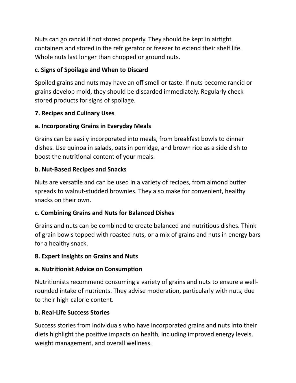 Nuts can go rancid if not stored properly. They should be kept in airtight containers and stored in the refrigerator or freezer to extend their shelf life. Whole nuts last longer than chopped or ground nuts. c. Signs of Spoilage and When to Discard Spoiled grains and nuts may have an off smell or taste. If nuts become rancid or grains develop mold, they should be discarded immediately. Regularly check stored products for signs of spoilage. 7. Recipes and Culinary Uses a. Incorporating Grains in Everyday Meals Grains can be easily incorporated into meals, from breakfast bowls to dinner dishes. Use quinoa in salads, oats in porridge, and brown rice as a side dish to boost the nutritional content of your meals. b. Nut-Based Recipes and Snacks Nuts are versatile and can be used in a variety of recipes, from almond butter spreads to walnut-studded brownies. They also make for convenient, healthy snacks on their own. c. Combining Grains and Nuts for Balanced Dishes Grains and nuts can be combined to create balanced and nutritious dishes. Think of grain bowls topped with roasted nuts, or a mix of grains and nuts in energy bars for a healthy snack. 8. Expert Insights on Grains and Nuts a. Nutritionist Advice on Consumption Nutritionists recommend consuming a variety of grains and nuts to ensure a well- rounded intake of nutrients. They advise moderation, particularly with nuts, due to their high-calorie content. b. Real-Life Success Stories Success stories from individuals who have incorporated grains and nuts into their diets highlight the positive impacts on health, including improved energy levels, weight management, and overall wellness.