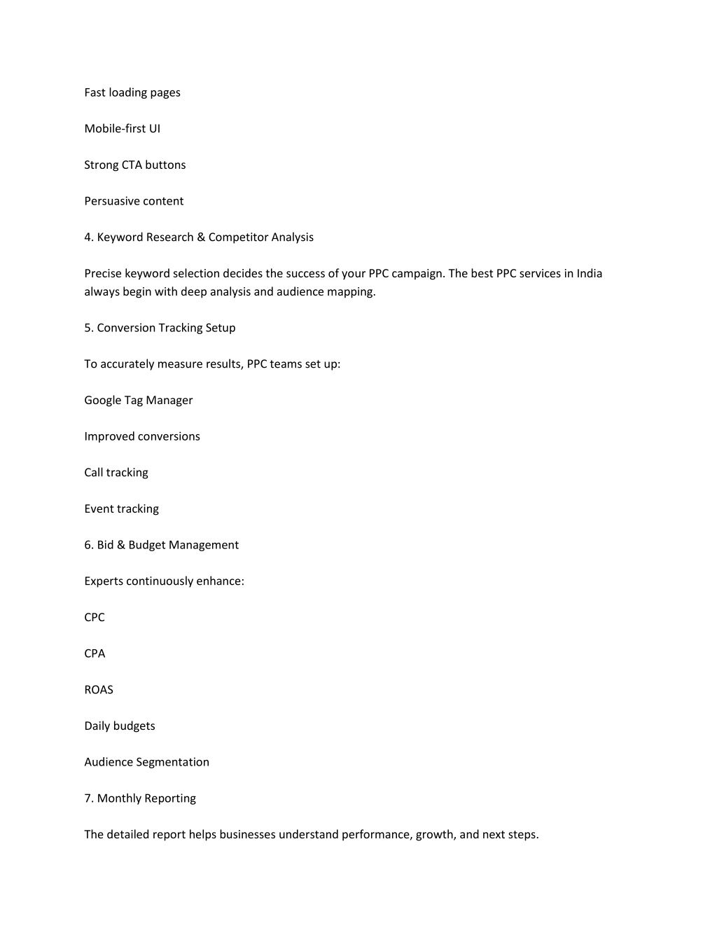 5. Fast loading pages Mobile-first UI Strong CTA buttons Persuasive content 4. Keyword Research & Competitor Analysis Precise keyword selection decides the success of your PPC campaign. The best PPC services in India always begin with deep analysis and audience mapping. 5. Conversion Tracking Setup To accurately measure results, PPC teams set up: Google Tag Manager Improved conversions Call tracking Event tracking 6. Bid & Budget Management Experts continuously enhance: CPC CPA ROAS Daily budgets Audience Segmentation 7. Monthly Reporting The detailed report helps businesses understand performance, growth, and next steps.