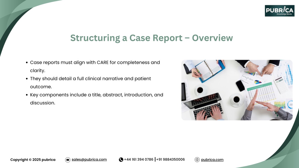 Structuring a Case Report – Overview Case reports must align with CARE for completeness and clarity. They should detail a full clinical narrative and patient outcome. Key components include a title, abstract, introduction, and discussion. sales@pubrica.com +44 161 394 0786 +91 9884350006 pubrica.com Copyright © 2025 pubrica
