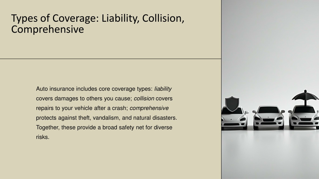 8. Types of Coverage: Liability, Collision, Comprehensive Auto insurance includes core coverage types: liability covers damages to others you cause; collision covers repairs to your vehicle after a crash; comprehensive protects against theft, vandalism, and natural disasters. Together, these provide a broad safety net for diverse risks.