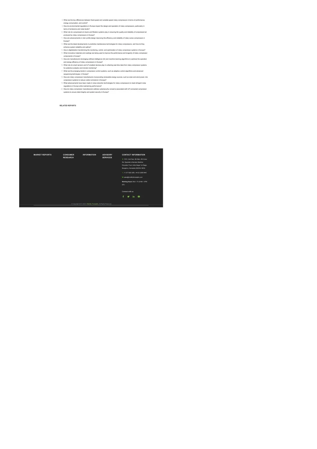 8. What are the key differences between fixed-speed and variable-speed rotary compressors in terms of performance, energy consumption, and control? 9. How do environmental regulations in Europe impact the design and operation of rotary compressors, particularly in terms of emissions and noise levels? 10. What role do compressed air dryers and filtration systems play in ensuring the quality and reliability of compressed air produced by rotary compressors in Europe? 11. How are advancements in rotor profile design improving the efficiency and reliability of rotary screw compressors in Europe? 12. What are the latest developments in predictive maintenance technologies for rotary compressors, and how do they enhance system reliability and uptime? 13. How is digitalization transforming the monitoring, control, and optimization of rotary compressor systems in Europe? 14. What innovative materials and coatings are being used to improve the performance and longevity of rotary compressor components in Europe? 15. How are manufacturers leveraging artificial intelligence (AI) and machine learning algorithms to optimize the operation and energy efficiency of rotary compressors in Europe? 16. What role do smart sensors and IoT-enabled devices play in collecting real-time data from rotary compressor systems for predictive analytics and remote monitoring? 17. What are the emerging trends in compressor control systems, such as adaptive control algorithms and advanced sequencing techniques, in Europe? 18. How are rotary compressor manufacturers incorporating renewable energy sources, such as solar and wind power, into compressor systems to reduce carbon emissions in Europe? 19. What advancements have been made in noise reduction technologies for rotary compressors to meet stringent noise regulations in Europe while maintaining performance? 20. How do rotary compressor manufacturers address cybersecurity concerns associated with IoT-connected compressor systems to ensure data integrity and system security in Europe? RELATED REPORTS MARKET REPORTS CONSUMER RESEARCH INFORMATION ADVISORY SERVICES CONTACT INFORMATION 172/1, 2nd Floor, 5th Main, 9th Cross Rd, Opposite to Kairalee Nikethan Education Trust, Indira Nagar 1st Stage, Bengaluru, Karnataka 560038, INDIA +1 217 636 3356, +44 20 3289 9440 sales@mobilityforesights.com Working Hours: Mon - Fri (9 AM - 9 PM IST) Connect with us © Copyright 2017-2023. Mobility Foresights. All Rights Reserved.