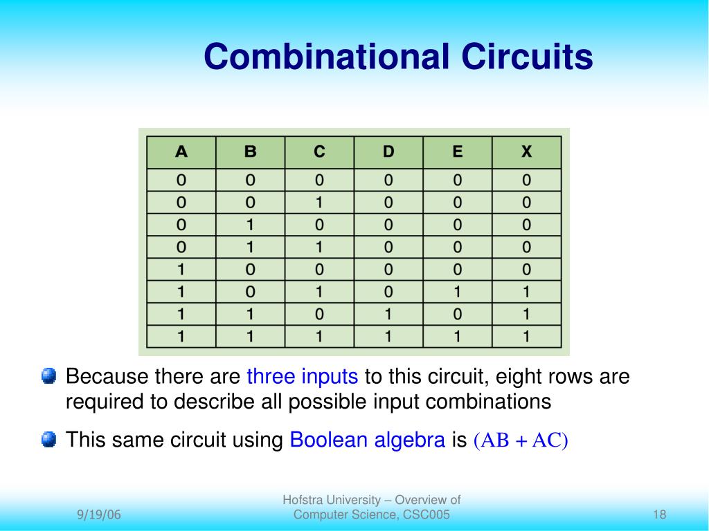 Hofstra University – Overview of Computer Science, CSC005 Combinational Circuits Because there are three inputs to this circuit, eight rows are required to describe all possible input combinations This same circuit using Boolean algebra is (AB + AC)