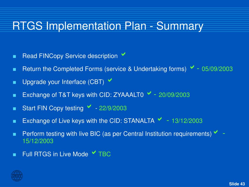 RTGS Implementation Plan - Summary • Read FINCopy Service description • Return the Completed Forms (service & Undertaking forms) - 05/09/2003 • Upgrade your Interface (CBT) • Exchange of T&T keys with CID: ZYAAALT0 - 20/09/2003 • Start FIN Copy testing - 22/9/2003 • Exchange of Live keys with the CID: STANALTA - 13/12/2003 • Perform testing with live BIC (as per Central Institution requirements) -15/12/2003 • Full RTGS in Live Mode TBC