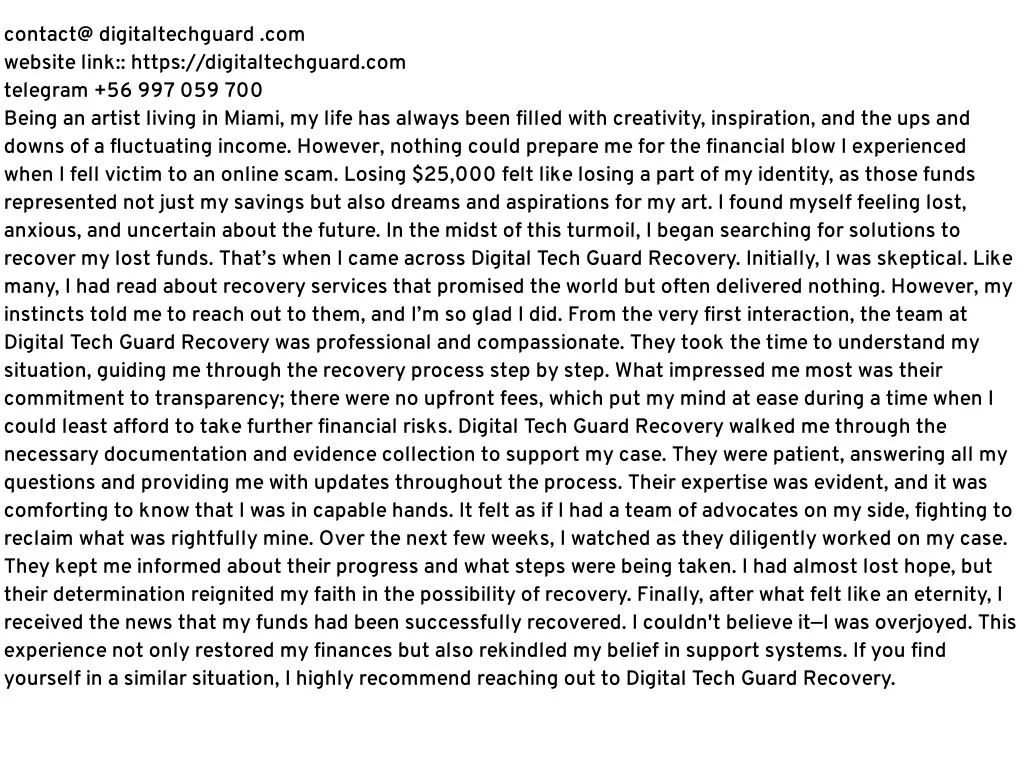 contact@ digitaltechguard .com website link:: https://digitaltechguard.com telegram +56 997 059 700 Being an artist living in Miami, my life has always been filled with creativity, inspiration, and the ups and downs of a fluctuating income. However, nothing could prepare me for the financial blow I experienced when I fell victim to an online scam. Losing $25,000 felt like losing a part of my identity, as those funds represented not just my savings but also dreams and aspirations for my art. I found myself feeling lost, anxious, and uncertain about the future. In the midst of this turmoil, I began searching for solutions to recover my lost funds. That’s when I came across Digital Tech Guard Recovery. Initially, I was skeptical. Like many, I had read about recovery services that promised the world but often delivered nothing. However, my instincts told me to reach out to them, and I’m so glad I did. From the very first interaction, the team at Digital Tech Guard Recovery was professional and compassionate. They took the time to understand my situation, guiding me through the recovery process step by step. What impressed me most was their commitment to transparency; there were no upfront fees, which put my mind at ease during a time when I could least afford to take further financial risks. Digital Tech Guard Recovery walked me through the necessary documentation and evidence collection to support my case. They were patient, answering all my questions and providing me with updates throughout the process. Their expertise was evident, and it was comforting to know that I was in capable hands. It felt as if I had a team of advocates on my side, fighting to reclaim what was rightfully mine. Over the next few weeks, I watched as they diligently worked on my case. They kept me informed about their progress and what steps were being taken. I had almost lost hope, but their determination reignited my faith in the possibility of recovery. Finally, after what felt like an eternity, I received the news that my funds had been successfully recovered. I couldn't believe it—I was overjoyed. This experience not only restored my finances but also rekindled my belief in support systems. If you find yourself in a similar situation, I highly recommend reaching out to Digital Tech Guard Recovery.