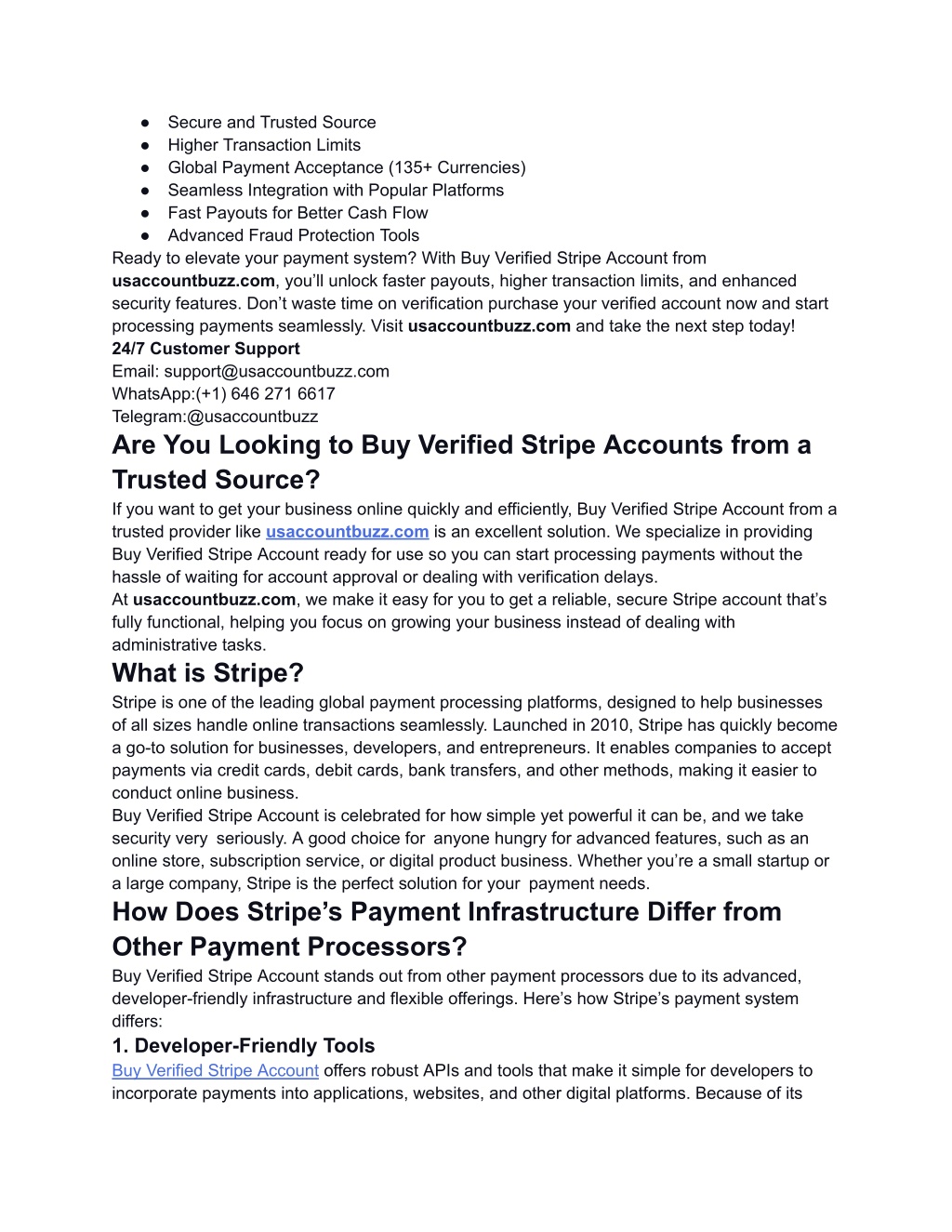 ● Secure and Trusted Source ● Higher Transaction Limits ● Global Payment Acceptance (135+ Currencies) ● Seamless Integration with Popular Platforms ● Fast Payouts for Better Cash Flow ● Advanced Fraud Protection Tools Ready to elevate your payment system? With Buy Verified Stripe Account from usaccountbuzz.com, you’ll unlock faster payouts, higher transaction limits, and enhanced security features. Don’t waste time on verification purchase your verified account now and start processing payments seamlessly. Visit usaccountbuzz.com and take the next step today! 24/7 Customer Support Email: support@usaccountbuzz.com WhatsApp:(+1) 646 271 6617 Telegram:@usaccountbuzz Are You Looking to Buy Verified Stripe Accounts from a Trusted Source? If you want to get your business online quickly and efficiently, Buy Verified Stripe Account from a trusted provider like usaccountbuzz.com is an excellent solution. We specialize in providing Buy Verified Stripe Account ready for use so you can start processing payments without the hassle of waiting for account approval or dealing with verification delays. At usaccountbuzz.com, we make it easy for you to get a reliable, secure Stripe account that’s fully functional, helping you focus on growing your business instead of dealing with administrative tasks. What is Stripe? Stripe is one of the leading global payment processing platforms, designed to help businesses of all sizes handle online transactions seamlessly. Launched in 2010, Stripe has quickly become a go-to solution for businesses, developers, and entrepreneurs. It enables companies to accept payments via credit cards, debit cards, bank transfers, and other methods, making it easier to conduct online business. Buy Verified Stripe Account is celebrated for how simple yet powerful it can be, and we take security very seriously. A good choice for anyone hungry for advanced features, such as an online store, subscription service, or digital product business. Whether you’re a small startup or a large company, Stripe is the perfect solution for your payment needs. How Does Stripe’s Payment Infrastructure Differ from Other Payment Processors? Buy Verified Stripe Account stands out from other payment processors due to its advanced, developer-friendly infrastructure and flexible offerings. Here’s how Stripe’s payment system differs: 1. Developer-Friendly Tools Buy Verified Stripe Account offers robust APIs and tools that make it simple for developers to incorporate payments into applications, websites, and other digital platforms. Because of its