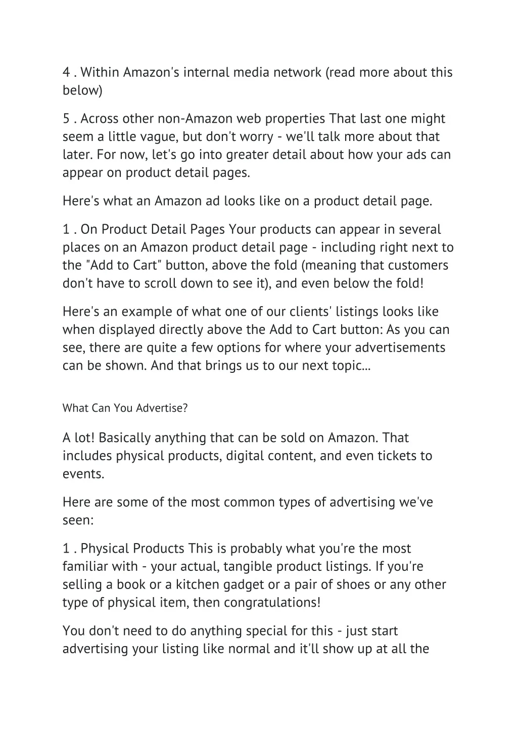 4 . Within Amazon's internal media network (read more about this below) 5 . Across other non-Amazon web properties That last one might seem a little vague, but don't worry - we'll talk more about that later. For now, let's go into greater detail about how your ads can appear on product detail pages. Here's what an Amazon ad looks like on a product detail page. 1 . On Product Detail Pages Your products can appear in several places on an Amazon product detail page - including right next to the "Add to Cart" button, above the fold (meaning that customers don't have to scroll down to see it), and even below the fold! Here's an example of what one of our clients' listings looks like when displayed directly above the Add to Cart button: As you can see, there are quite a few options for where your advertisements can be shown. And that brings us to our next topic... What Can You Advertise? A lot! Basically anything that can be sold on Amazon. That includes physical products, digital content, and even tickets to events. Here are some of the most common types of advertising we've seen: 1 . Physical Products This is probably what you're the most familiar with - your actual, tangible product listings. If you're selling a book or a kitchen gadget or a pair of shoes or any other type of physical item, then congratulations! You don't need to do anything special for this - just start advertising your listing like normal and it'll show up at all the