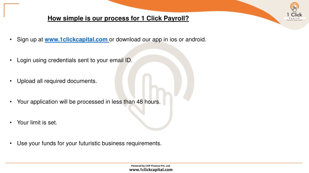How simple is our process for 1 Click Payroll? • Sign up at www.1clickcapital.com or download our app in ios or android. • Login using credentials sent to your email ID. • Upload all required documents. • Your application will be processed in less than 48 hours. • Your limit is set. • Use your funds for your futuristic business requirements.