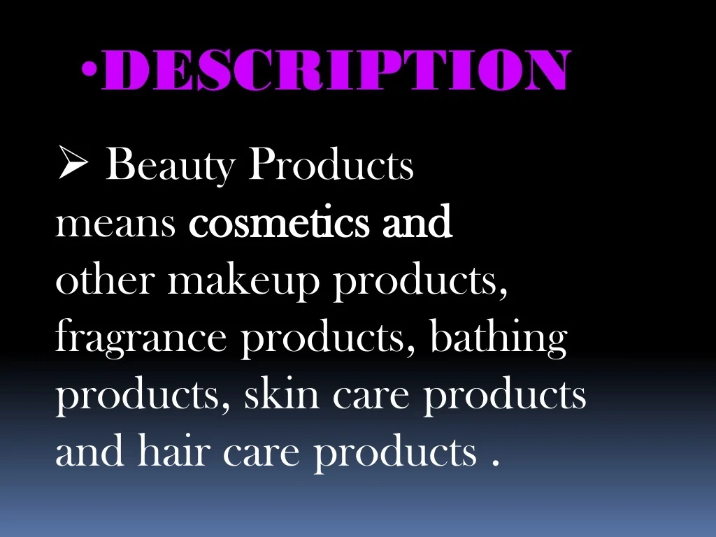 DESCRIPTION • Beauty Products means cosmetics and other makeup products, fragrance products, bathing products, skin care products and hair care products .