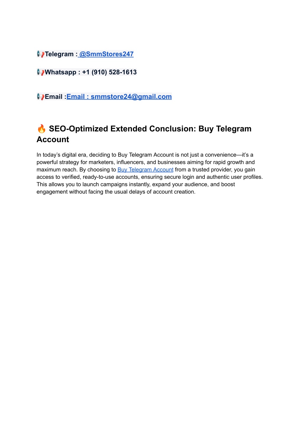 ?Telegram : @SmmStores247 ?Whatsapp : +1 (910) 528-1613 ?Email :Email : smmstore24@gmail.com ? SEO-Optimized Extended Conclusion: Buy Telegram Account In today’s digital era, deciding to Buy Telegram Account is not just a convenience—it’s a powerful strategy for marketers, influencers, and businesses aiming for rapid growth and maximum reach. By choosing to Buy Telegram Account from a trusted provider, you gain access to verified, ready-to-use accounts, ensuring secure login and authentic user profiles. This allows you to launch campaigns instantly, expand your audience, and boost engagement without facing the usual delays of account creation.