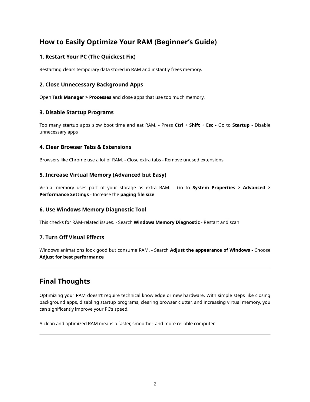 2. How to Easily Optimize Your RAM (Beginner’s Guide) 1. Restart Your PC (The Quickest Fix) Restarting clears temporary data stored in RAM and instantly frees memory. 2. Close Unnecessary Background Apps Open Task Manager > Processes and close apps that use too much memory. 3. Disable Startup Programs Too many startup apps slow boot time and eat RAM. - Press Ctrl + Shift + Esc - Go to Startup - Disable unnecessary apps 4. Clear Browser Tabs & Extensions Browsers like Chrome use a lot of RAM. - Close extra tabs - Remove unused extensions 5. Increase Virtual Memory (Advanced but Easy) Virtual memory uses part of your storage as extra RAM. - Go to System Properties > Advanced > Performance Settings - Increase the paging file size 6. Use Windows Memory Diagnostic Tool This checks for RAM-related issues. - Search Windows Memory Diagnostic - Restart and scan 7. Turn Off Visual Effects Windows animations look good but consume RAM. - Search Adjust the appearance of Windows - Choose Adjust for best performance Final Thoughts Optimizing your RAM doesn’t require technical knowledge or new hardware. With simple steps like closing background apps, disabling startup programs, clearing browser clutter, and increasing virtual memory, you can significantly improve your PC’s speed. A clean and optimized RAM means a faster, smoother, and more reliable computer. 2