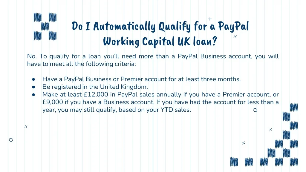 Do I Automatically Qualify for a PayPal Working Capital UK loan? No. To qualify for a loan you’ll need more than a PayPal Business account, you will have to meet all the following criteria: Have a PayPal Business or Premier account for at least three months. Be registeredin the United Kingdom. Make at least £12,000 in PayPal sales annually if you have a Premier account, or £9,000 if you have a Business account. If you have had the account for less than a year, you may still qualify, based on your YTD sales. ● ● ●