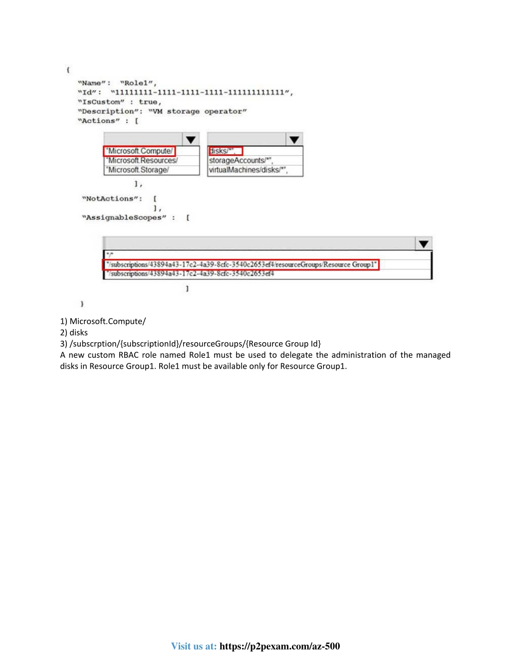 1) Microsoft.Compute/ 2) disks 3) /subscrption/{subscriptionId}/resourceGroups/{Resource Group Id} A new custom RBAC role named Role1 must be used to delegate the administration of the managed disks in Resource Group1. Role1 must be available only for Resource Group1. Visit us at: https://p2pexam.com/az-500