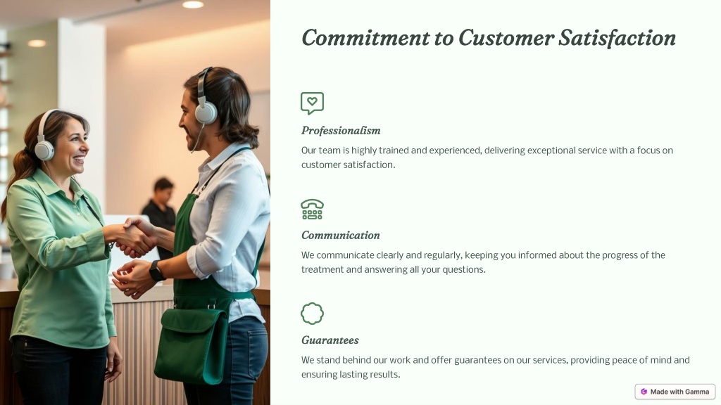 Commitment to Customer Satisfaction Professionalism Our team is highly trained and experienced, delivering exceptional service with a focus on customer satisfaction. Communication We communicate clearly and regularly, keeping you informed about the progress of the treatment and answering all your questions. Guarantees We stand behind our work and offer guarantees on our services, providing peace of mind and ensuring lasting results.