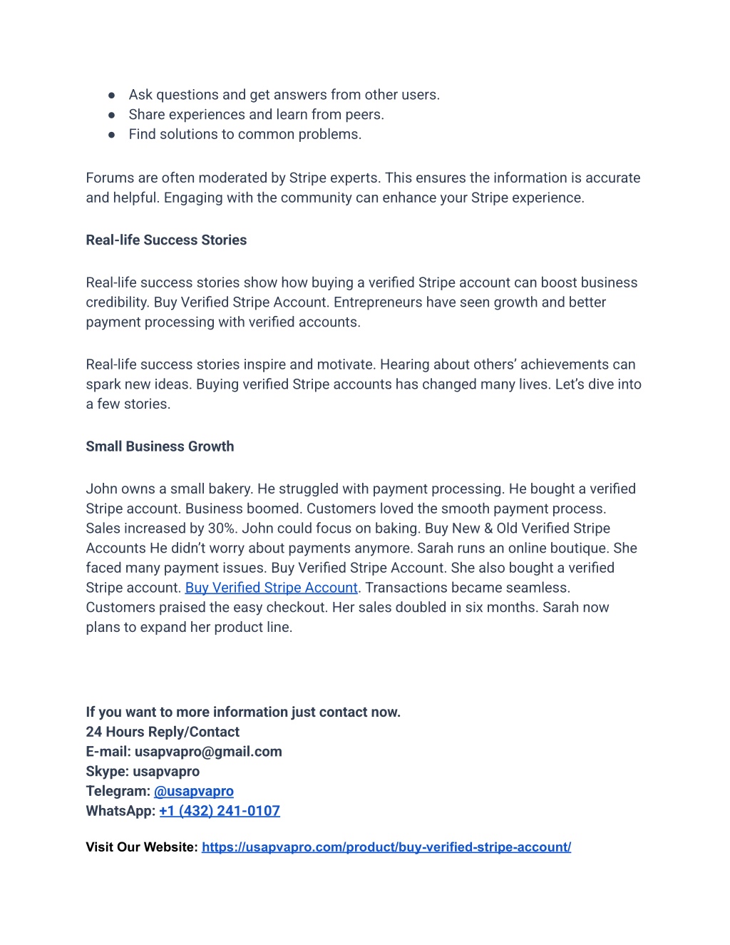 ● Ask questions and get answers from other users. ● Share experiences and learn from peers. ● Find solutions to common problems. Forums are often moderated by Stripe experts. This ensures the information is accurate and helpful. Engaging with the community can enhance your Stripe experience. Real-life Success Stories Real-life success stories show how buying a verified Stripe account can boost business credibility. Buy Verified Stripe Account. Entrepreneurs have seen growth and better payment processing with verified accounts. Real-life success stories inspire and motivate. Hearing about others’ achievements can spark new ideas. Buying verified Stripe accounts has changed many lives. Let’s dive into a few stories. Small Business Growth John owns a small bakery. He struggled with payment processing. He bought a verified Stripe account. Business boomed. Customers loved the smooth payment process. Sales increased by 30%. John could focus on baking. Buy New & Old Verified Stripe Accounts He didn’t worry about payments anymore. Sarah runs an online boutique. She faced many payment issues. Buy Verified Stripe Account. She also bought a verified Stripe account. Buy Verified Stripe Account. Transactions became seamless. Customers praised the easy checkout. Her sales doubled in six months. Sarah now plans to expand her product line. If you want to more information just contact now. 24 Hours Reply/Contact E-mail: usapvapro@gmail.com Skype: usapvapro Telegram: @usapvapro WhatsApp: +1 (432) 241-0107 Visit Our Website: https://usapvapro.com/product/buy-verified-stripe-account/