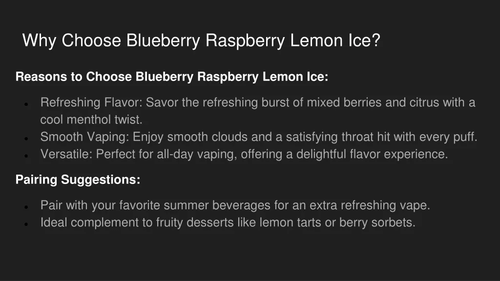 Why Choose Blueberry Raspberry Lemon Ice? Reasons to Choose Blueberry Raspberry Lemon Ice: • Refreshing Flavor: Savor the refreshing burst of mixed berries and citrus with a cool menthol twist. • Smooth Vaping: Enjoy smooth clouds and a satisfying throat hit with every puff. • Versatile: Perfect for all-day vaping, offering a delightful flavor experience. Pairing Suggestions: • Pair with your favorite summer beverages for an extra refreshing vape. • Ideal complement to fruity desserts like lemon tarts or berry sorbets.