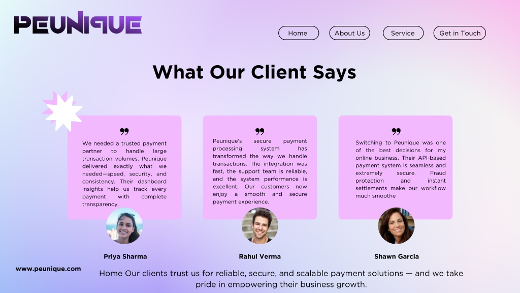 Home About Us Service Get in Touch What Our Client Says Peunique’s processing transformed the way we handle transactions. The integration was fast, the support team is reliable, and the system performance is excellent. Our customers now enjoy a smooth payment experience. secure system payment Switching to Peunique was one of the best decisions for my online business. Their API-based payment system is seamless and extremely secure. protection and settlements make our workflow much smoothe We needed a trusted payment partner to transaction volumes. Peunique delivered exactly what we needed—speed, security, and consistency. Their dashboard insights help us track every payment with transparency. has handle large Fraud instant and secure complete Priya Sharma Rahul Verma Shawn Garcia www.peunique.com Home Our clients trust us for reliable, secure, and scalable payment solutions — and we take pride in empowering their business growth.