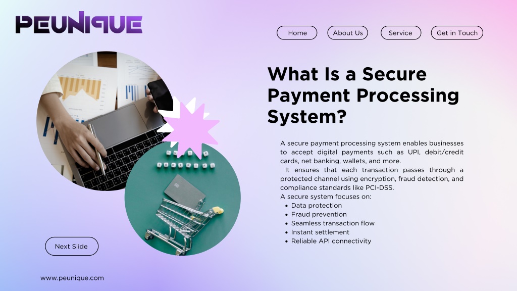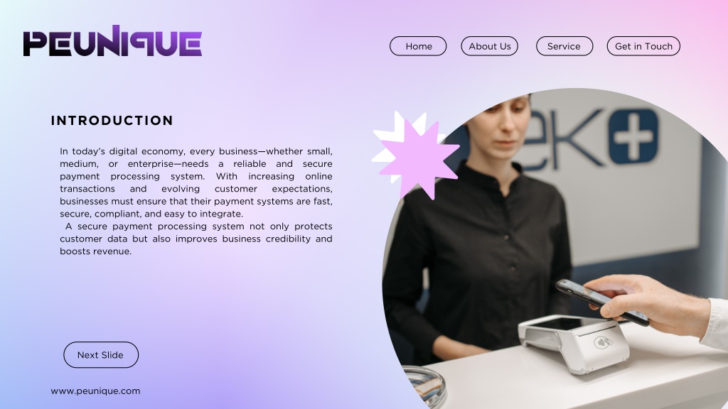 Home About Us Service Get in Touch INTRODUCTION In today’s digital economy, every business—whether small, medium, or enterprise—needs a reliable and secure payment processing system. With increasing online transactions and evolving businesses must ensure that their payment systems are fast, secure, compliant, and easy to integrate. A secure payment processing system not only protects customer data but also improves business credibility and boosts revenue. customer expectations, Next Slide www.peunique.com