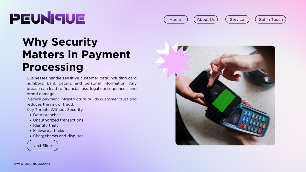 Home About Us Service Get in Touch Why Security Matters in Payment Processing Businesses handle sensitive customer data including card numbers, bank details, and personal information. Any breach can lead to financial loss, legal consequences, and brand damage. Secure payment infrastructure builds customer trust and reduces the risk of fraud. Key Threats Without Security Data breaches Unauthorized transactions Identity theft Malware attacks Chargebacks and disputes Next Slide www.peunique.com