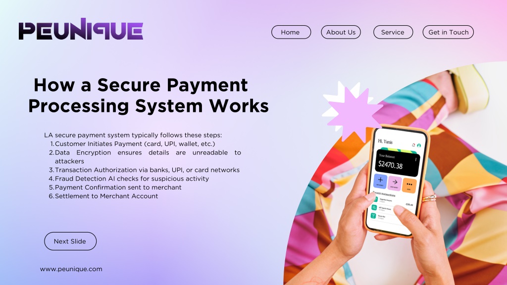 Home About Us Service Get in Touch How a Secure Payment Processing System Works LA secure payment system typically follows these steps: 1.Customer Initiates Payment (card, UPI, wallet, etc.) 2.Data Encryption ensures details are unreadable to attackers 3.Transaction Authorization via banks, UPI, or card networks 4.Fraud Detection AI checks for suspicious activity 5.Payment Confirmation sent to merchant 6.Settlement to Merchant Account Next Slide www.peunique.com