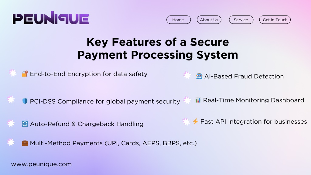 Home About Us Service Get in Touch Key Features of a Secure Payment Processing System ? End-to-End Encryption for data safety ? AI-Based Fraud Detection ? Real-Time Monitoring Dashboard ? PCI-DSS Compliance for global payment security ⚡ Fast API Integration for businesses ? Auto-Refund & Chargeback Handling ? Multi-Method Payments (UPI, Cards, AEPS, BBPS, etc.) www.peunique.com