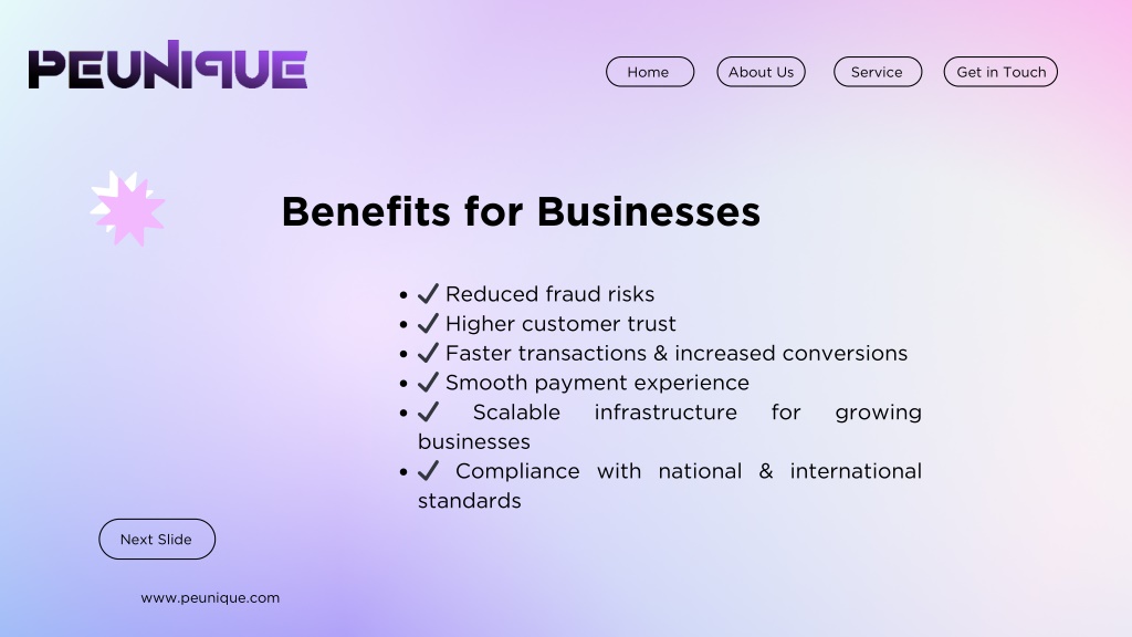 Home About Us Service Get in Touch Benefits for Businesses ✔ Reduced fraud risks ✔ Higher customer trust ✔ Faster transactions & increased conversions ✔ Smooth payment experience ✔ Scalable infrastructure businesses ✔ Compliance with national & international standards for growing Next Slide www.peunique.com