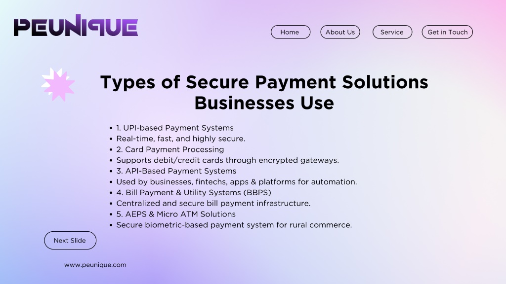 Home About Us Service Get in Touch Types of Secure Payment Solutions Businesses Use 1. UPI-based Payment Systems Real-time, fast, and highly secure. 2. Card Payment Processing Supports debit/credit cards through encrypted gateways. 3. API-Based Payment Systems Used by businesses, fintechs, apps & platforms for automation. 4. Bill Payment & Utility Systems (BBPS) Centralized and secure bill payment infrastructure. 5. AEPS & Micro ATM Solutions Secure biometric-based payment system for rural commerce. Next Slide www.peunique.com