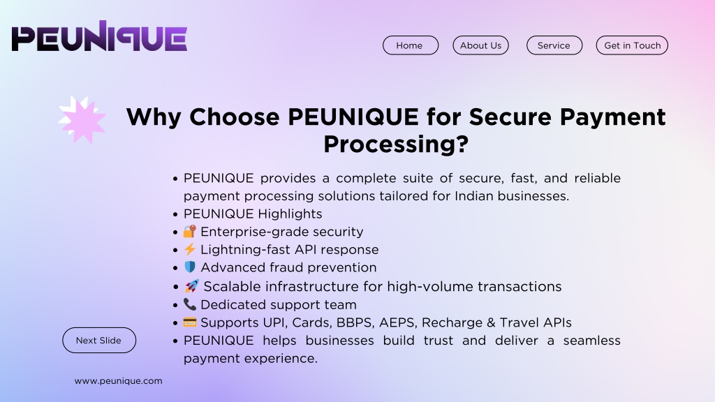 Home About Us Service Get in Touch Why Choose PEUNIQUE for Secure Payment Processing? PEUNIQUE provides a complete suite of secure, fast, and reliable payment processing solutions tailored for Indian businesses. PEUNIQUE Highlights ? Enterprise-grade security ⚡ Lightning-fast API response ? Advanced fraud prevention ? Scalable infrastructure for high-volume transactions ? Dedicated support team ? Supports UPI, Cards, BBPS, AEPS, Recharge & Travel APIs PEUNIQUE helps businesses build trust and deliver a seamless payment experience. Next Slide www.peunique.com