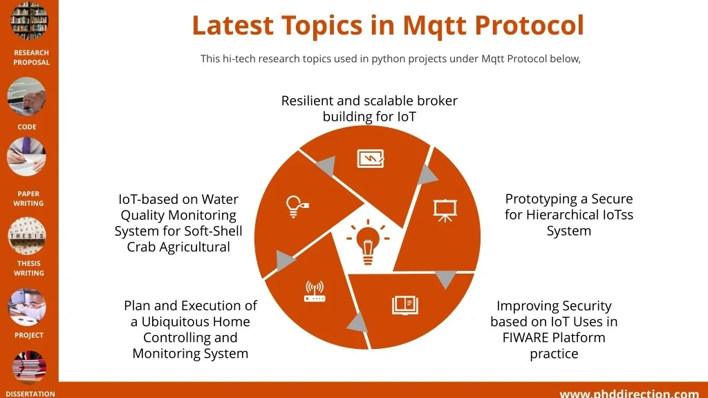 Research Topics in Mqtt Protocol RESEARCH PROPOSAL These are the research areas which developed under Mqtt Protocol in Python, Reducing Overhead on Data Discovery Collision Avoidance System CODE PAPER WRITING Reliable Routing Protocols THESIS WRITING Communication Techniques Smart Monitoring System PROJECT www.phddirection.com DISSERTATION