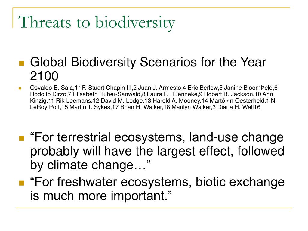 Threats to biodiversity • Global Biodiversity Scenarios for the Year 2100 • Osvaldo E. Sala,1* F. Stuart Chapin III,2 Juan J. Armesto,4 Eric Berlow,5 Janine BloomÞeld,6 Rodolfo Dirzo,7 Elisabeth Huber-Sanwald,8 Laura F. Huenneke,9 Robert B. Jackson,10 Ann Kinzig,11 Rik Leemans,12 David M. Lodge,13 Harold A. Mooney,14 Martõ «n Oesterheld,1 N. LeRoy Poff,15 Martin T. Sykes,17 Brian H. Walker,18 Marilyn Walker,3 Diana H. Wall16 • “For terrestrial ecosystems, land-use change probably will have the largest effect, followed by climate change…” • “For freshwater ecosystems, biotic exchange is much more important.”