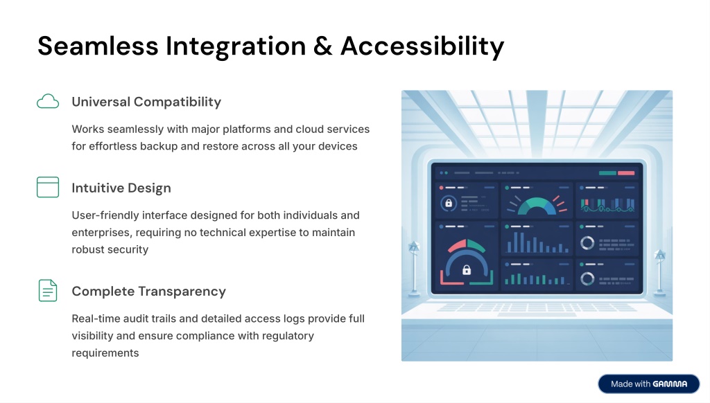 Seamless Integration & Accessibility Universal Compatibility Works seamlessly with major platforms and cloud services for effortless backup and restore across all your devices Intuitive Design User-friendly interface designed for both individuals and enterprises, requiring no technical expertise to maintain robust security Complete Transparency Real-time audit trails and detailed access logs provide full visibility and ensure compliance with regulatory requirements