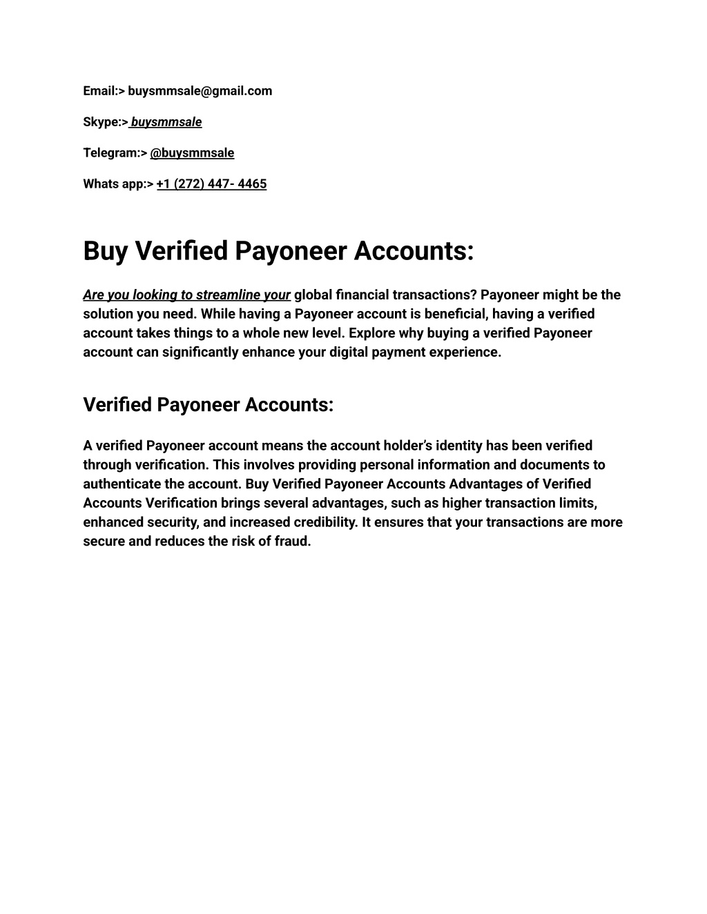 Email:> buysmmsale@gmail.com Skype:> buysmmsale Telegram:> @buysmmsale Whats app:> +1 (272) 447- 4465 Buy Verified Payoneer Accounts: Are you looking to streamline your global financial transactions? Payoneer might be the solution you need. While having a Payoneer account is beneficial, having a verified account takes things to a whole new level. Explore why buying a verified Payoneer account can significantly enhance your digital payment experience. Verified Payoneer Accounts: A verified Payoneer account means the account holder’s identity has been verified through verification. This involves providing personal information and documents to authenticate the account. Buy Verified Payoneer Accounts Advantages of Verified Accounts Verification brings several advantages, such as higher transaction limits, enhanced security, and increased credibility. It ensures that your transactions are more secure and reduces the risk of fraud.