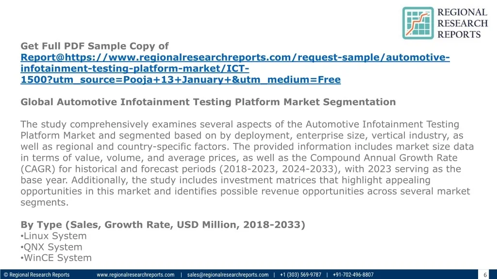 Get Full PDF Sample Copy of Report@https://www.regionalresearchreports.com/request-sample/automotive- infotainment-testing-platform-market/ICT- 1500?utm_source=Pooja+13+January+&utm_medium=Free Global Automotive Infotainment Testing Platform Market Segmentation The study comprehensively examines several aspects of the Automotive Infotainment Testing Platform Market and segmented based on by deployment, enterprise size, vertical industry, as well as regional and country-specific factors. The provided information includes market size data in terms of value, volume, and average prices, as well as the Compound Annual Growth Rate (CAGR) for historical and forecast periods (2018-2023, 2024-2033), with 2023 serving as the base year. Additionally, the study includes investment matrices that highlight appealing opportunities in this market and identifies possible revenue opportunities across several market segments. By Type (Sales, Growth Rate, USD Million, 2018-2033) •Linux System •QNX System •WinCE System © Regional Research Reports www.regionalresearchreports.com | sales@regionalresearchreports.com | +1 (303) 569-9787 | +91-702-496-8807 6