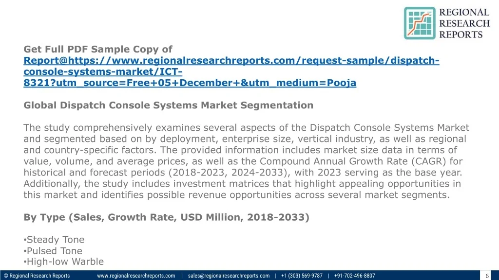 Get Full PDF Sample Copy of Report@https://www.regionalresearchreports.com/request-sample/dispatch- console-systems-market/ICT- 8321?utm_source=Free+05+December+&utm_medium=Pooja Global Dispatch Console Systems Market Segmentation The study comprehensively examines several aspects of the Dispatch Console Systems Market and segmented based on by deployment, enterprise size, vertical industry, as well as regional and country-specific factors. The provided information includes market size data in terms of value, volume, and average prices, as well as the Compound Annual Growth Rate (CAGR) for historical and forecast periods (2018-2023, 2024-2033), with 2023 serving as the base year. Additionally, the study includes investment matrices that highlight appealing opportunities in this market and identifies possible revenue opportunities across several market segments. By Type (Sales, Growth Rate, USD Million, 2018-2033) •Steady Tone •Pulsed Tone •High-low Warble © Regional Research Reports www.regionalresearchreports.com | sales@regionalresearchreports.com | +1 (303) 569-9787 | +91-702-496-8807 6