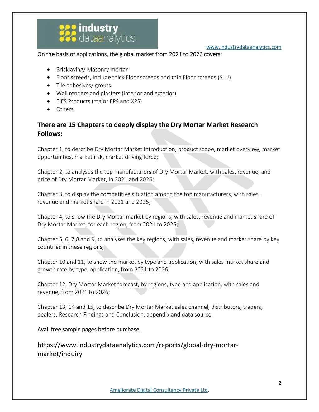www.industrydataanalytics.com On the basis of applications, the global market from 2021 to 2026 covers: On the basis of applications, the global market from 2021 to 2026 covers: •Bricklaying/ Masonry mortar •Floor screeds, include thick Floor screeds and thin Floor screeds (SLU) •Tile adhesives/ grouts •Wall renders and plasters (interior and exterior) •EIFS Products (major EPS and XPS) •Others There are 15 Chapters to deeply display the Dry Mortar Market Research Follows: Chapter 1, to describe Dry Mortar Market Introduction, product scope, market overview, market opportunities, market risk, market driving force; Chapter 2, to analyses the top manufacturers of Dry Mortar Market, with sales, revenue, and price of Dry Mortar Market, in 2021 and 2026; Chapter 3, to display the competitive situation among the top manufacturers, with sales, revenue and market share in 2021 and 2026; Chapter 4, to show the Dry Mortar market by regions, with sales, revenue and market share of Dry Mortar Market, for each region, from 2021 to 2026; Chapter 5, 6, 7,8 and 9, to analyses the key regions, with sales, revenue and market share by key countries in these regions; Chapter 10 and 11, to show the market by type and application, with sales market share and growth rate by type, application, from 2021 to 2026; Chapter 12, Dry Mortar Market forecast, by regions, type and application, with sales and revenue, from 2021 to 2026; Chapter 13, 14 and 15, to describe Dry Mortar Market sales channel, distributors, traders, dealers, Research Findings and Conclusion, appendix and data source. Avail free sample pages before purchase: Avail free sample pages before purchase: https://www.industrydataanalytics.com/reports/global-dry-mortar- market/inquiry 2 Ameliorate Digital Consultancy Private Ltd.