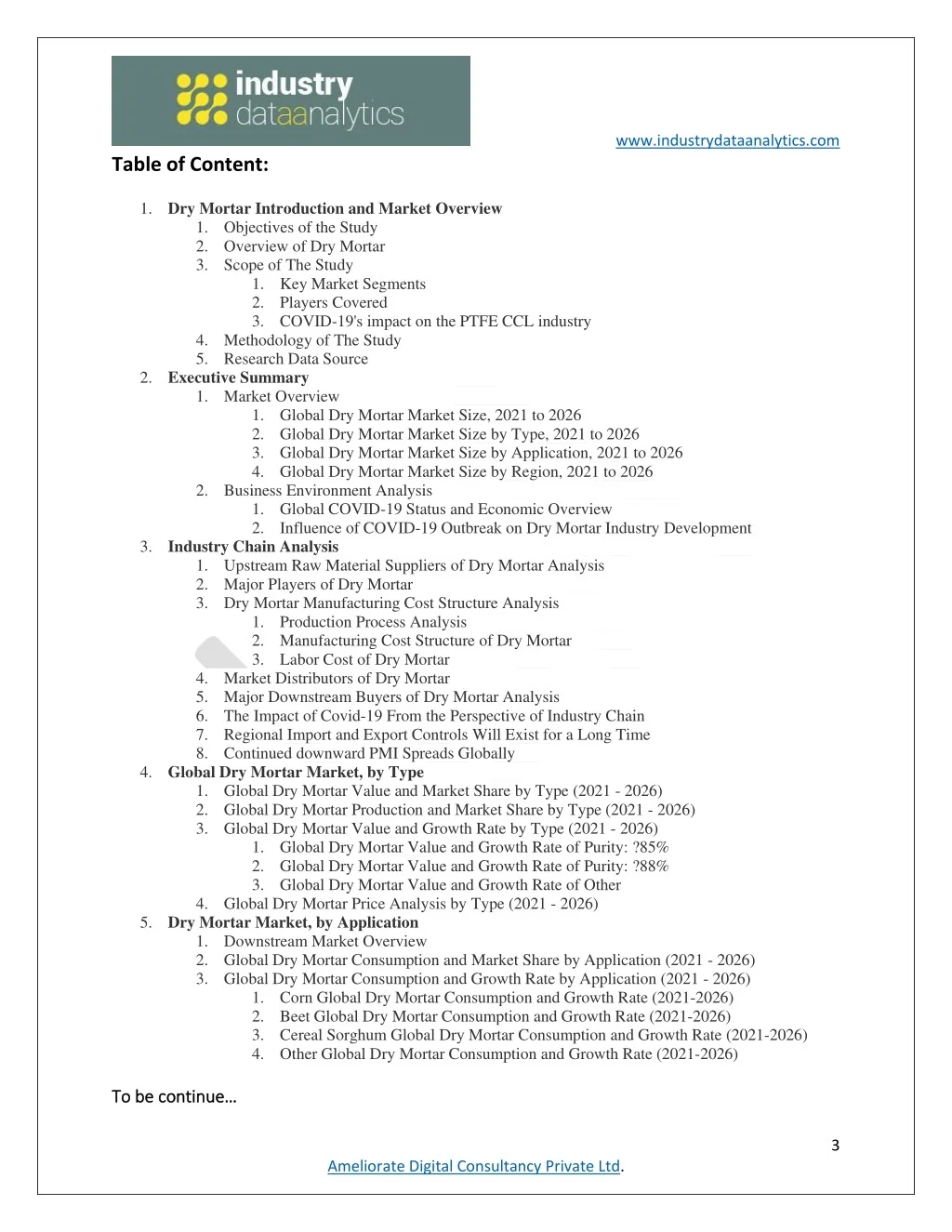 www.industrydataanalytics.com Table of Content: 1.Dry Mortar Introduction and Market Overview 1.Objectives of the Study 2.Overview of Dry Mortar 3.Scope of The Study 1.Key Market Segments 2.Players Covered 3.COVID-19's impact on the PTFE CCL industry 4.Methodology of The Study 5.Research Data Source 2.Executive Summary 1.Market Overview 1.Global Dry Mortar Market Size, 2021 to 2026 2.Global Dry Mortar Market Size by Type, 2021 to 2026 3.Global Dry Mortar Market Size by Application, 2021 to 2026 4.Global Dry Mortar Market Size by Region, 2021 to 2026 2.Business Environment Analysis 1.Global COVID-19 Status and Economic Overview 2.Influence of COVID-19 Outbreak on Dry Mortar Industry Development 3.Industry Chain Analysis 1.Upstream Raw Material Suppliers of Dry Mortar Analysis 2.Major Players of Dry Mortar 3.Dry Mortar Manufacturing Cost Structure Analysis 1.Production Process Analysis 2.Manufacturing Cost Structure of Dry Mortar 3.Labor Cost of Dry Mortar 4.Market Distributors of Dry Mortar 5.Major Downstream Buyers of Dry Mortar Analysis 6.The Impact of Covid-19 From the Perspective of Industry Chain 7.Regional Import and Export Controls Will Exist for a Long Time 8.Continued downward PMI Spreads Globally 4.Global Dry Mortar Market, by Type 1.Global Dry Mortar Value and Market Share by Type (2021 - 2026) 2.Global Dry Mortar Production and Market Share by Type (2021 - 2026) 3.Global Dry Mortar Value and Growth Rate by Type (2021 - 2026) 1.Global Dry Mortar Value and Growth Rate of Purity: ?85% 2.Global Dry Mortar Value and Growth Rate of Purity: ?88% 3.Global Dry Mortar Value and Growth Rate of Other 4.Global Dry Mortar Price Analysis by Type (2021 - 2026) 5.Dry Mortar Market, by Application 1.Downstream Market Overview 2.Global Dry Mortar Consumption and Market Share by Application (2021 - 2026) 3.Global Dry Mortar Consumption and Growth Rate by Application (2021 - 2026) 1.Corn Global Dry Mortar Consumption and Growth Rate (2021-2026) 2.Beet Global Dry Mortar Consumption and Growth Rate (2021-2026) 3.Cereal Sorghum Global Dry Mortar Consumption and Growth Rate (2021-2026) 4.Other Global Dry Mortar Consumption and Growth Rate (2021-2026) To be continue… To be continue… 3 Ameliorate Digital Consultancy Private Ltd.