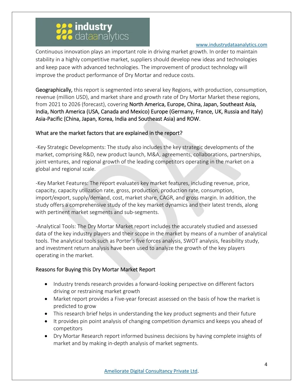 www.industrydataanalytics.com Continuous innovation plays an important role in driving market growth. In order to maintain stability in a highly competitive market, suppliers should develop new ideas and technologies and keep pace with advanced technologies. The improvement of product technology will improve the product performance of Dry Mortar and reduce costs. Geographically, Geographically, this report is segmented into several key Regions, with production, consumption, revenue (million USD), and market share and growth rate of Dry Mortar Market these regions, from 2021 to 2026 (forecast), covering North America, Europe North America, Europe, China, Japan, Southeast Asia, India, North America (USA, Canada and Mexico) Europe (Germany, France, UK, Russia and Italy) India, North America (USA, Canada and Mexico) Europe (Germany, France, UK, Russia and Italy) Asia Asia- -Pacific (China, Japan, Korea, India and Southeast Asia) and ROW. Pacific (China, Japan, Korea, India and Southeast Asia) and ROW. , China, Japan, Southeast Asia, What are the market factors that are explained in the report? What are the market factors that are explained in the report? -Key Strategic Developments: The study also includes the key strategic developments of the market, comprising R&D, new product launch, M&A, agreements, collaborations, partnerships, joint ventures, and regional growth of the leading competitors operating in the market on a global and regional scale. -Key Market Features: The report evaluates key market features, including revenue, price, capacity, capacity utilization rate, gross, production, production rate, consumption, import/export, supply/demand, cost, market share, CAGR, and gross margin. In addition, the study offers a comprehensive study of the key market dynamics and their latest trends, along with pertinent market segments and sub-segments. -Analytical Tools: The Dry Mortar Market report includes the accurately studied and assessed data of the key industry players and their scope in the market by means of a number of analytical tools. The analytical tools such as Porter's five forces analysis, SWOT analysis, feasibility study, and investment return analysis have been used to analyze the growth of the key players operating in the market. Reasons for Buying this Reasons for Buying this Dry Mortar Dry Mortar Market Report Market Report •Industry trends research provides a forward-looking perspective on different factors driving or restraining market growth •Market report provides a Five-year forecast assessed on the basis of how the market is predicted to grow •This research brief helps in understanding the key product segments and their future •It provides pin point analysis of changing competition dynamics and keeps you ahead of competitors •Dry Mortar Research report informed business decisions by having complete insights of market and by making in-depth analysis of market segments. 4 Ameliorate Digital Consultancy Private Ltd.