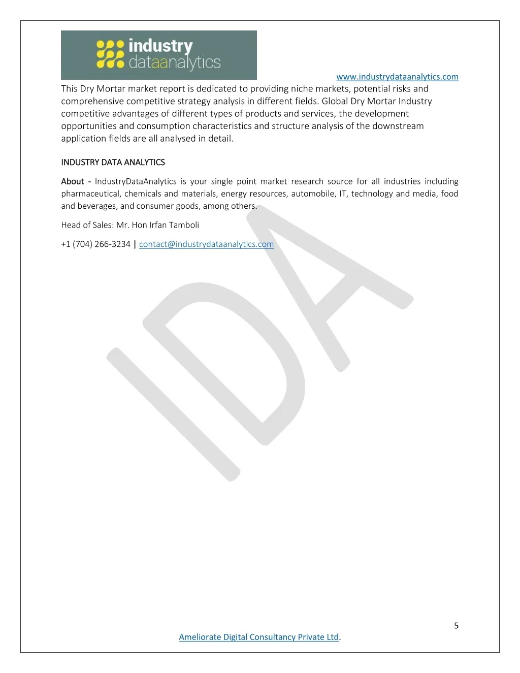 www.industrydataanalytics.com This Dry Mortar market report is dedicated to providing niche markets, potential risks and comprehensive competitive strategy analysis in different fields. Global Dry Mortar Industry competitive advantages of different types of products and services, the development opportunities and consumption characteristics and structure analysis of the downstream application fields are all analysed in detail. INDUSTRY DATA ANALYTICS INDUSTRY DATA ANALYTICS About About - - IndustryDataAnalytics is your single point market research source for all industries including pharmaceutical, chemicals and materials, energy resources, automobile, IT, technology and media, food and beverages, and consumer goods, among others. Head of Sales: Mr. Hon Irfan Tamboli +1 (704) 266-3234 | | contact@industrydataanalytics.com 5 Ameliorate Digital Consultancy Private Ltd.