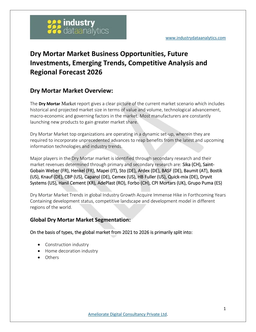 www.industrydataanalytics.com Dry Mortar Market Business Opportunities, Future Investments, Emerging Trends, Competitive Analysis and Regional Forecast 2026 Dry Mortar Market Overview: The Dry Mortar Market report gives a clear picture of the current market scenario which includes historical and projected market size in terms of value and volume, technological advancement, macro-economic and governing factors in the market. Most manufacturers are constantly launching new products to gain greater market share. Dry Mortar Market top organizations are operating in a dynamic set-up, wherein they are required to incorporate unprecedented advances to reap benefits from the latest and upcoming information technologies and industry trends. Major players in the Dry Mortar market is identified through secondary research and their market revenues determined through primary and secondary research are: Sika (CH), Saint Gobain Weber (FR), Henkel (FR), Mapei (IT), Sto (DE), Ardex (DE), BASF (DE), Baumit (AT), Bostik Gobain Weber (FR), Henkel (FR), Mapei (IT), Sto (DE), Ardex (DE), BASF (DE), Baumit (AT), Bostik (US), Knauf (DE), CB (US), Knauf (DE), CBP (US), Caparol (DE), Cemex (US), HB Fuller (US), Quick P (US), Caparol (DE), Cemex (US), HB Fuller (US), Quick- -mix (DE), Dryvit Systems (US), Hanil Cement (KR), AdePlast (RO), Forbo (CH), CPI Mortars (UK), Grupo Puma (ES) Systems (US), Hanil Cement (KR), AdePlast (RO), Forbo (CH), CPI Mortars (UK), Grupo Puma (ES) Sika (CH), Saint- - mix (DE), Dryvit Dry Mortar Market Trends in global Industry Growth Acquire Immense Hike in Forthcoming Years Containing development status, competitive landscape and development model in different regions of the world. Global Dry Mortar Market Segmentation: On the basis of types, the global market from 2021 to 2026 is primarily split into: On the basis of types, the global market from 2021 to 2026 is primarily split into: •Construction industry •Home decoration industry •Others 1 Ameliorate Digital Consultancy Private Ltd.