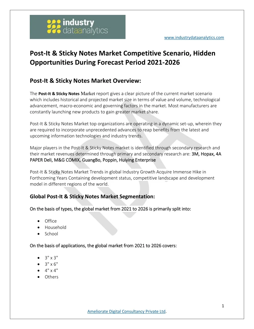 www.industrydataanalytics.com Post-It & Sticky Notes Market Competitive Scenario, Hidden Opportunities During Forecast Period 2021-2026 Post-It & Sticky Notes Market Overview: The Post-It & Sticky Notes Market report gives a clear picture of the current market scenario which includes historical and projected market size in terms of value and volume, technological advancement, macro-economic and governing factors in the market. Most manufacturers are constantly launching new products to gain greater market share. Post-It & Sticky Notes Market top organizations are operating in a dynamic set-up, wherein they are required to incorporate unprecedented advances to reap benefits from the latest and upcoming information technologies and industry trends. Major players in the Post-It & Sticky Notes market is identified through secondary research and their market revenues determined through primary and secondary research are: 3M PAPER PAPER Deli Deli, , M&G M&G COMIX COMIX, , GuangBo GuangBo, , Poppin Poppin, , Huiying Enterprise Huiying Enterprise 3M, , Hopax Hopax, , 4A 4A Post-It & Sticky Notes Market Trends in global Industry Growth Acquire Immense Hike in Forthcoming Years Containing development status, competitive landscape and development model in different regions of the world. Global Post-It & Sticky Notes Market Segmentation: On the basis On the basis of types, the global market from 2021 to 2026 is primarily split into: of types, the global market from 2021 to 2026 is primarily split into: •Office •Household •School On the basis of applications, the global market from 2021 to 2026 covers: On the basis of applications, the global market from 2021 to 2026 covers: •3" x 3" •3" x 6" •4" x 4" •Others 1 Ameliorate Digital Consultancy Private Ltd.