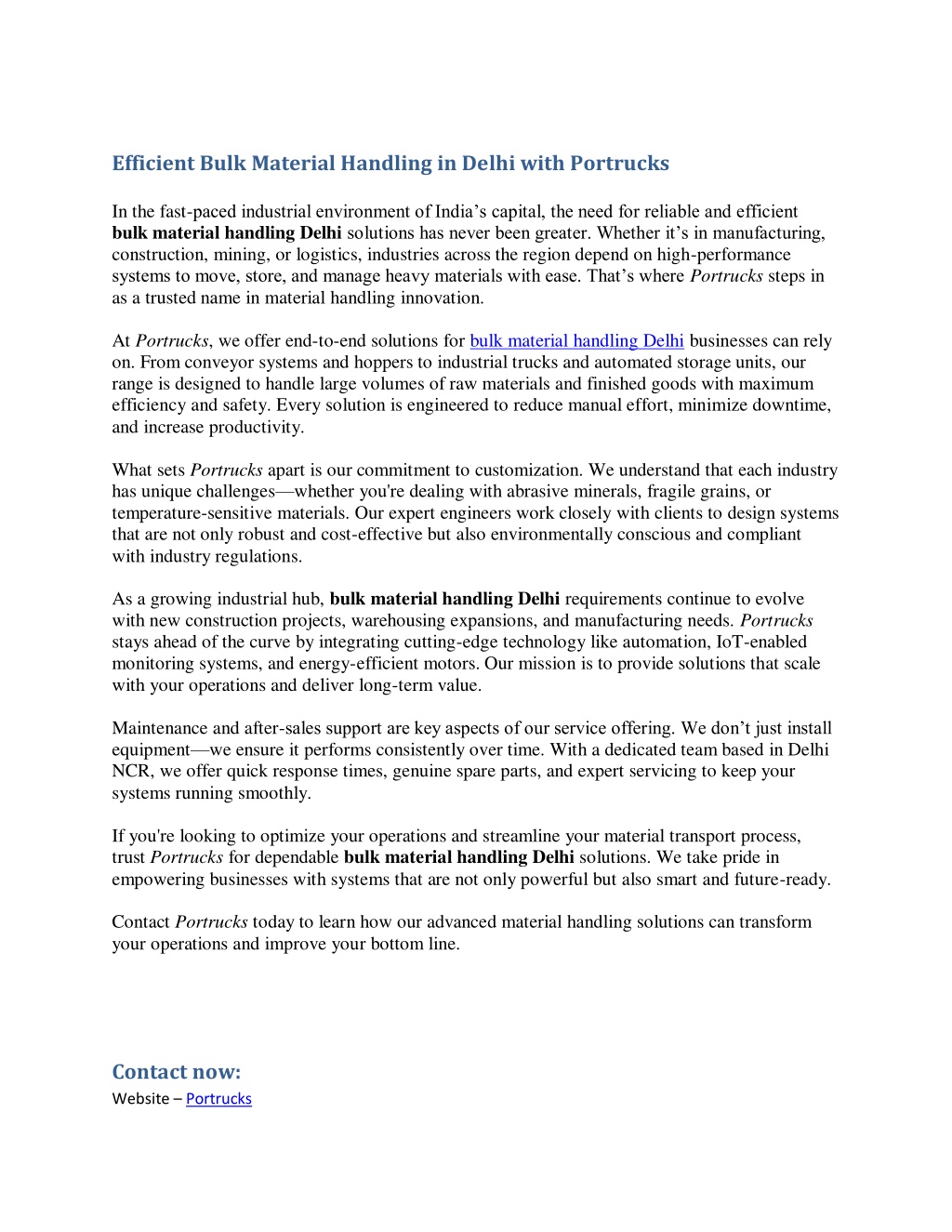 Efficient Bulk Material Handling in Delhi with Portrucks In the fast-paced industrial environment of India’s capital, the need for reliable and efficient bulk material handling Delhisolutions has never been greater. Whether it’s in manufacturing, construction, mining, or logistics, industries across the region depend on high-performance systems to move, store, and manage heavy materials with ease. That’s where Portrucks steps in as a trusted name in material handling innovation. At Portrucks, we offer end-to-end solutions for bulk material handling Delhi businesses can rely on. From conveyor systems and hoppers to industrial trucks and automated storage units, our range is designed to handle large volumes of raw materials and finished goods with maximum efficiency and safety. Every solution is engineered to reduce manual effort, minimize downtime, and increase productivity. What sets Portrucks apart is our commitment to customization. We understand that each industry has unique challenges—whether you're dealing with abrasive minerals, fragile grains, or temperature-sensitive materials. Our expert engineers work closely with clients to design systems that are not only robust and cost-effective but also environmentally conscious and compliant with industry regulations. As a growing industrial hub, bulk material handling Delhi requirements continue to evolve with new construction projects, warehousing expansions, and manufacturing needs. Portrucks stays ahead of the curve by integrating cutting-edge technology like automation, IoT-enabled monitoring systems, and energy-efficient motors. Our mission is to provide solutions that scale with your operations and deliver long-term value. Maintenance and after-sales support are key aspects of our service offering. We don’t just install equipment—we ensure it performs consistently over time. With a dedicated team based in Delhi NCR, we offer quick response times, genuine spare parts, and expert servicing to keep your systems running smoothly. If you're looking to optimize your operations and streamline your material transport process, trust Portrucks for dependable bulk material handling Delhi solutions. We take pride in empowering businesses with systems that are not only powerful but also smart and future-ready. Contact Portrucks today to learn how our advanced material handling solutions can transform your operations and improve your bottom line. Contact now: Website – Portrucks