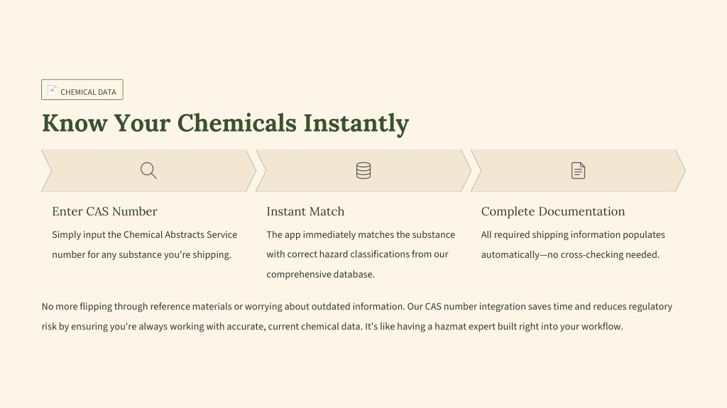 CHEMICAL DATA Know Your Chemicals Instantly Enter CAS Number Instant Match Complete Documentation Simply input the Chemical Abstracts Service number for any substance you're shipping. The app immediately matches the substance with correct hazard classifications from our comprehensive database. All required shipping information populates automatically—no cross-checking needed. No more flipping through reference materials or worrying about outdated information. Our CAS number integration saves time and reduces regulatory risk by ensuring you're always working with accurate, current chemical data. It's like having a hazmat expert built right into your workflow.